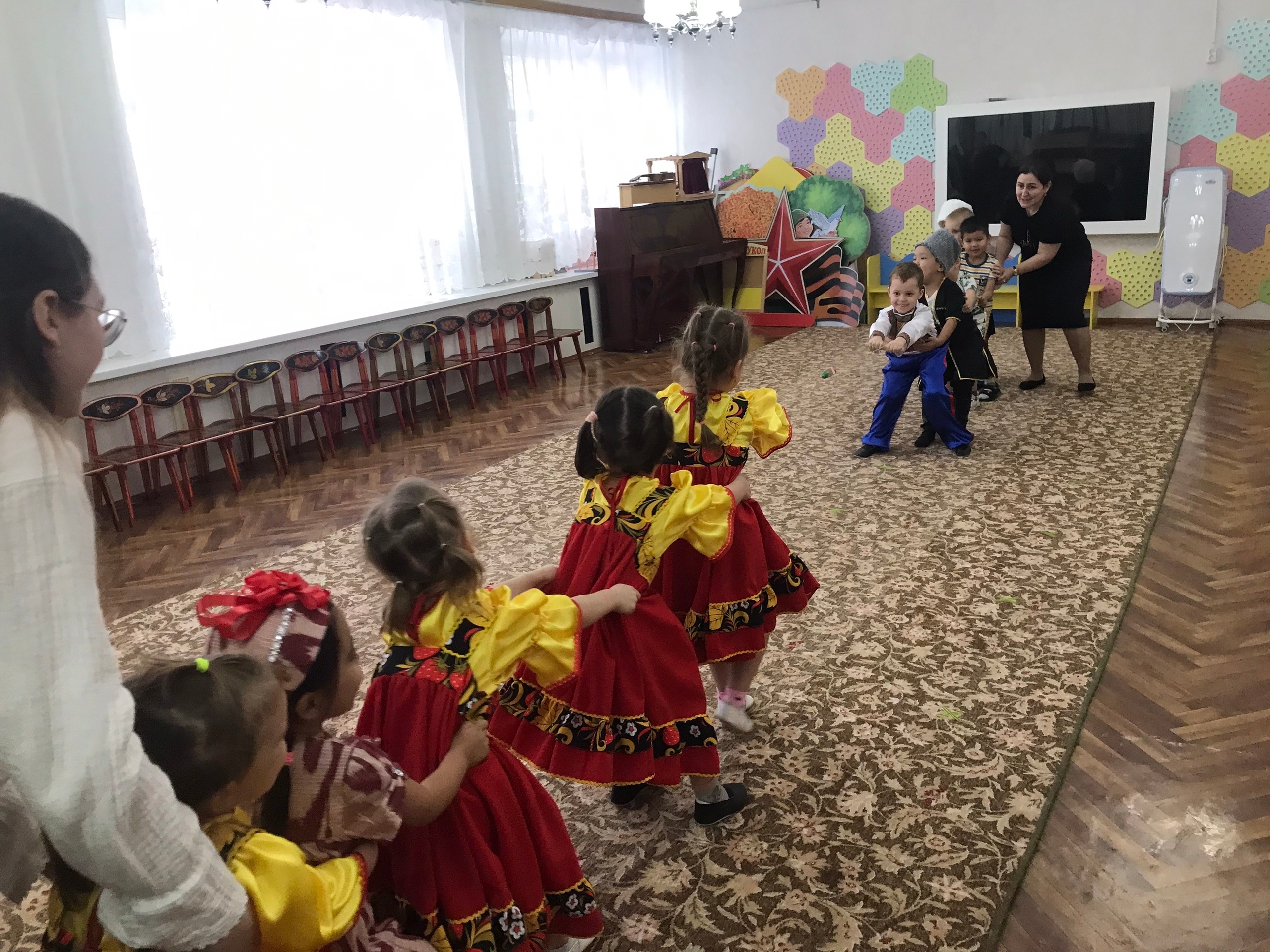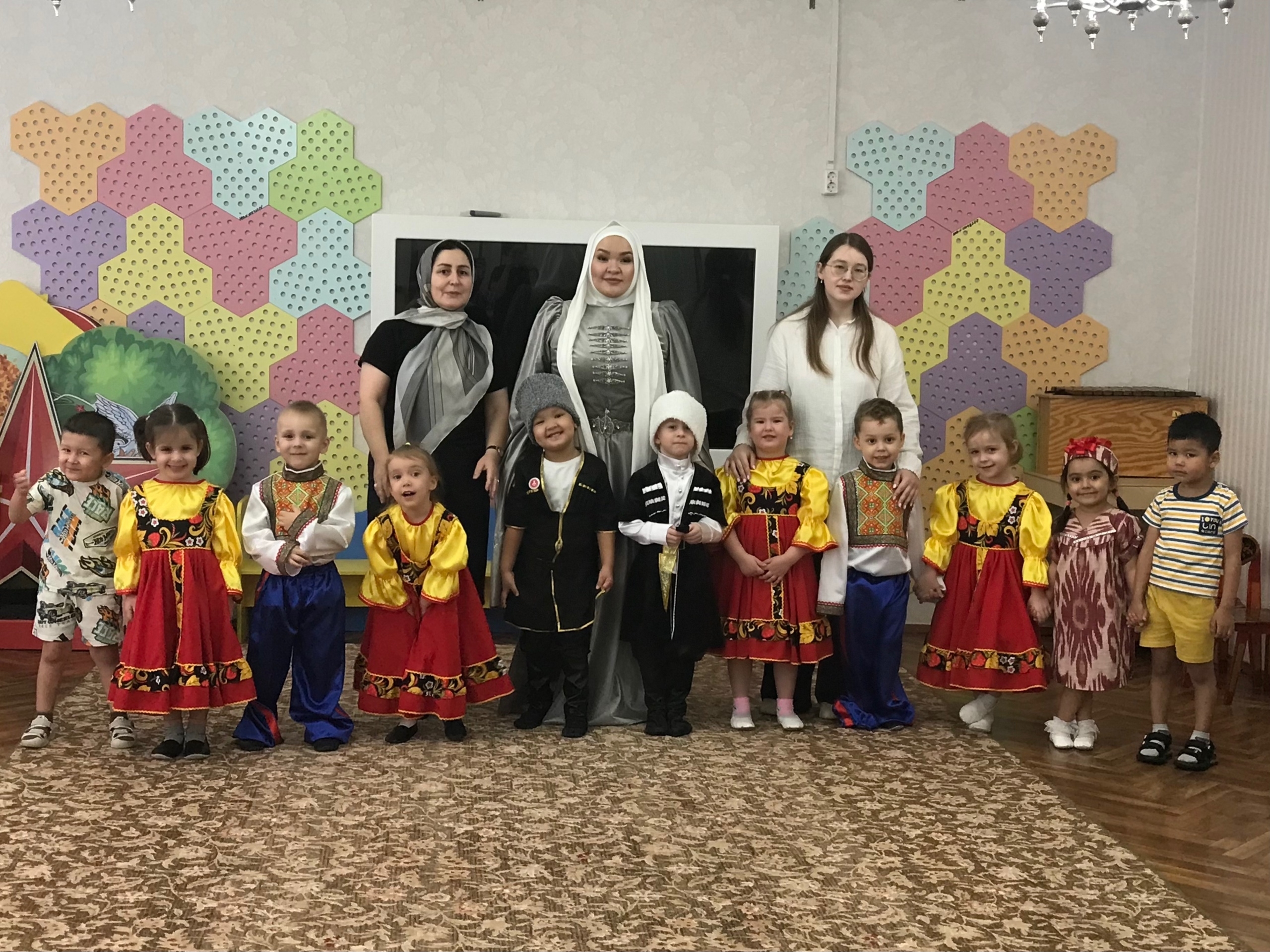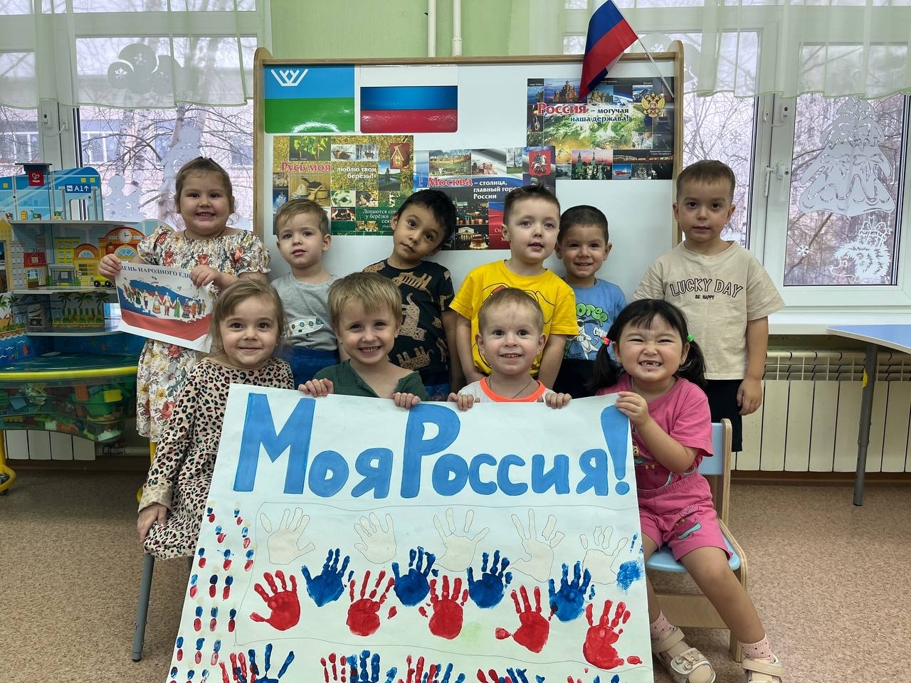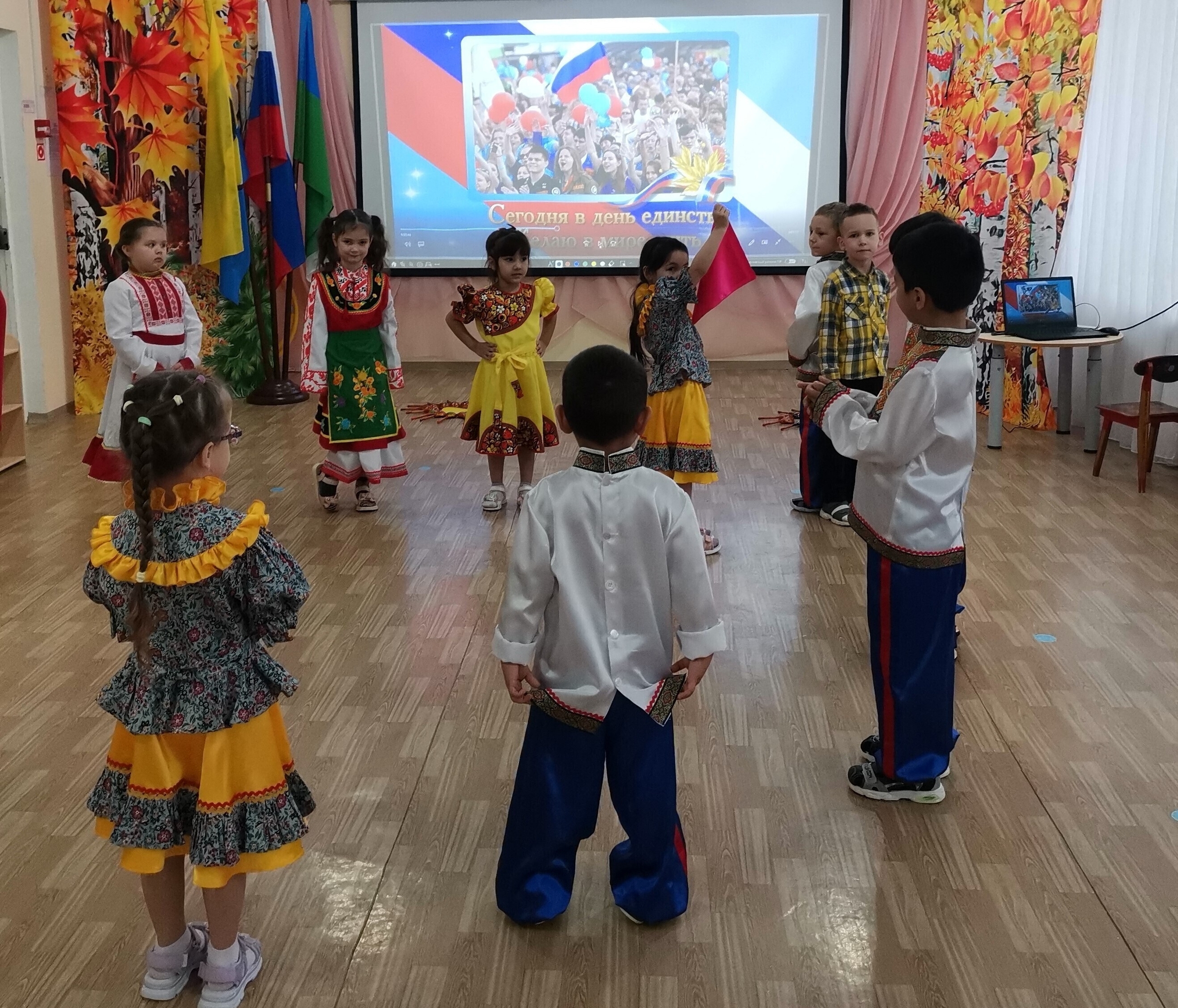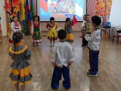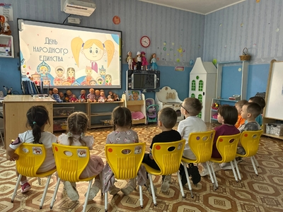 День народного единства-это объединения всех народов нашей великой страны, всех поколений нашей державы. Каждый народ самобытен, имеет свою культуру, обычаи, интересные традиции. Во время тематической недели посвященной этому празднику дети в нашем детском саду прошли музыкальные развлечения где дети пели песни, отгадывали загадки, знакомились с пословицами, поговорками, и играли в задорные игры нашей большой страны. В группах старшего дошкольного возраста прошли тематическое занятия «Дружат дети всей земли», на которых дети разгадывали загадки на тему истории народного единства, посмотрели иллюстрации и костюмы народов нашей большой страны, вспомнили символы России.
